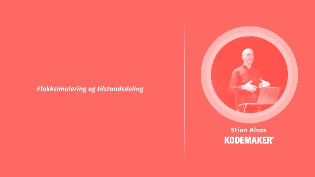 Gjennom en live demo med flokksimulering i nettleseren viser Stian hvordan man kan dele tilstand på tvers av vinduer. Her brukes det utelukkende webteknologi uten en server.